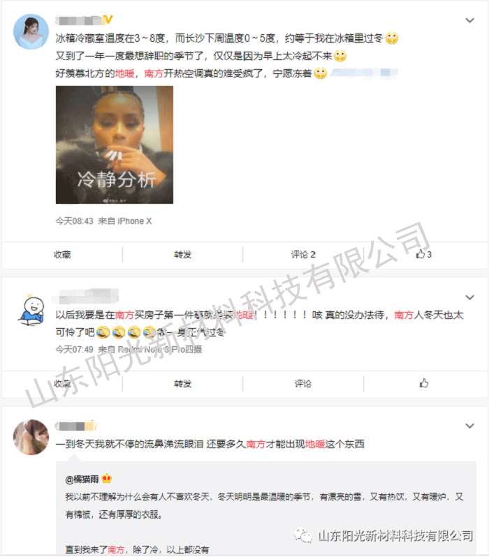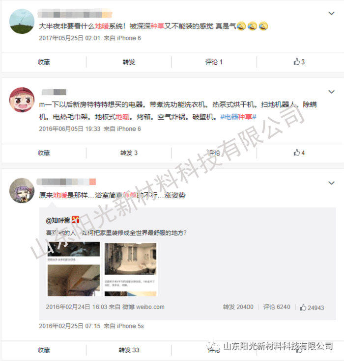 近幾年,隨著生活水平的提高,南方地區(qū)的家用采暖設(shè)備也已從奢侈品逐漸變?yōu)榱似胀ㄏM(fèi)品,所以越來(lái)越多的人家也都將地暖納入和中央空調(diào)、新風(fēng)并列為必需的裝修三件套里了。微博上的小伙伴也紛紛從各個(gè)渠道種草地暖~